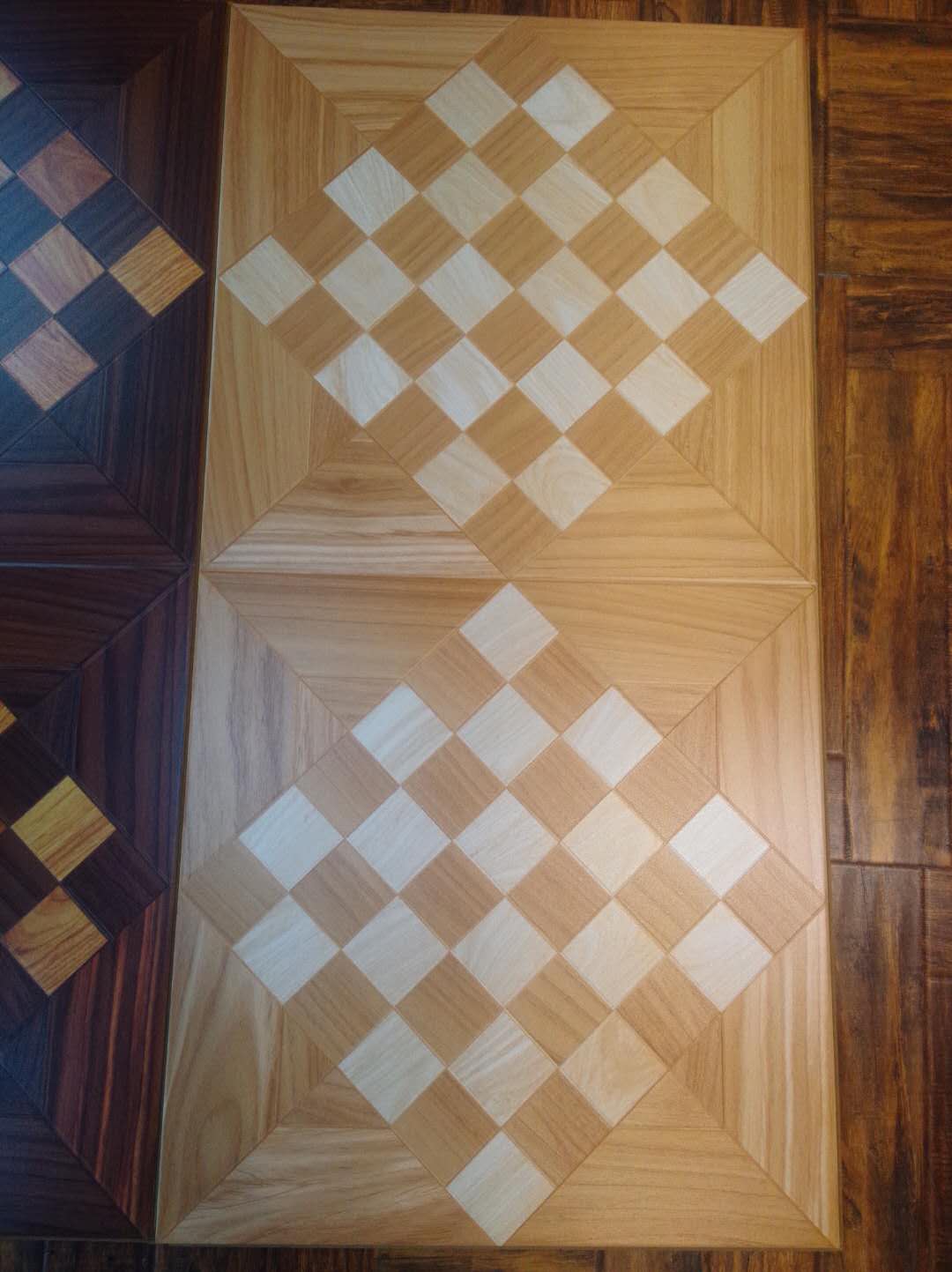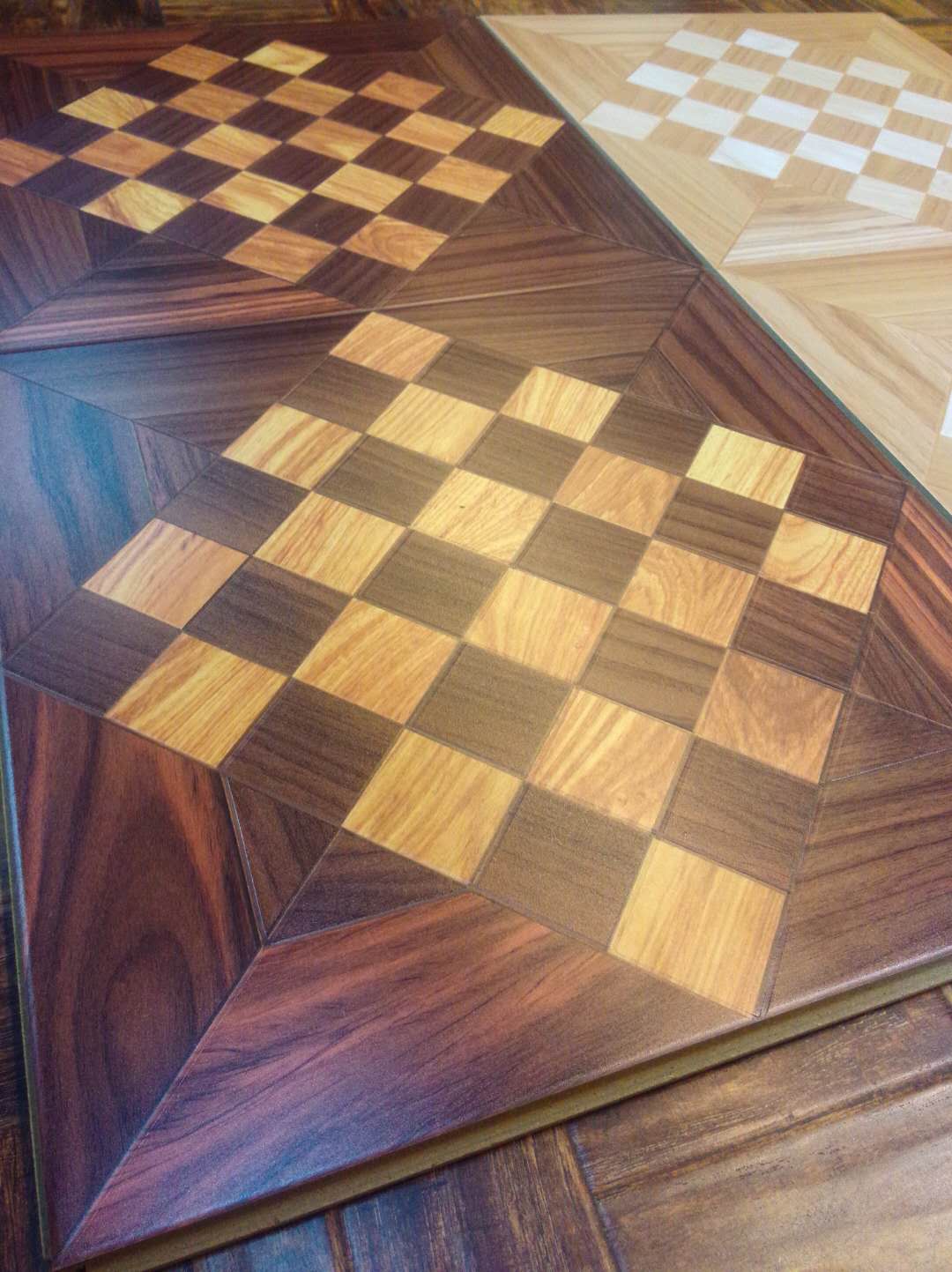直线拼花是用剪切好的木片直接拼接造型,根据不同木材的颜色、纹路,可拼出多种造型,每一片都是那么别致多彩。适合室内大面积的使用,可做地面,墙饰等。